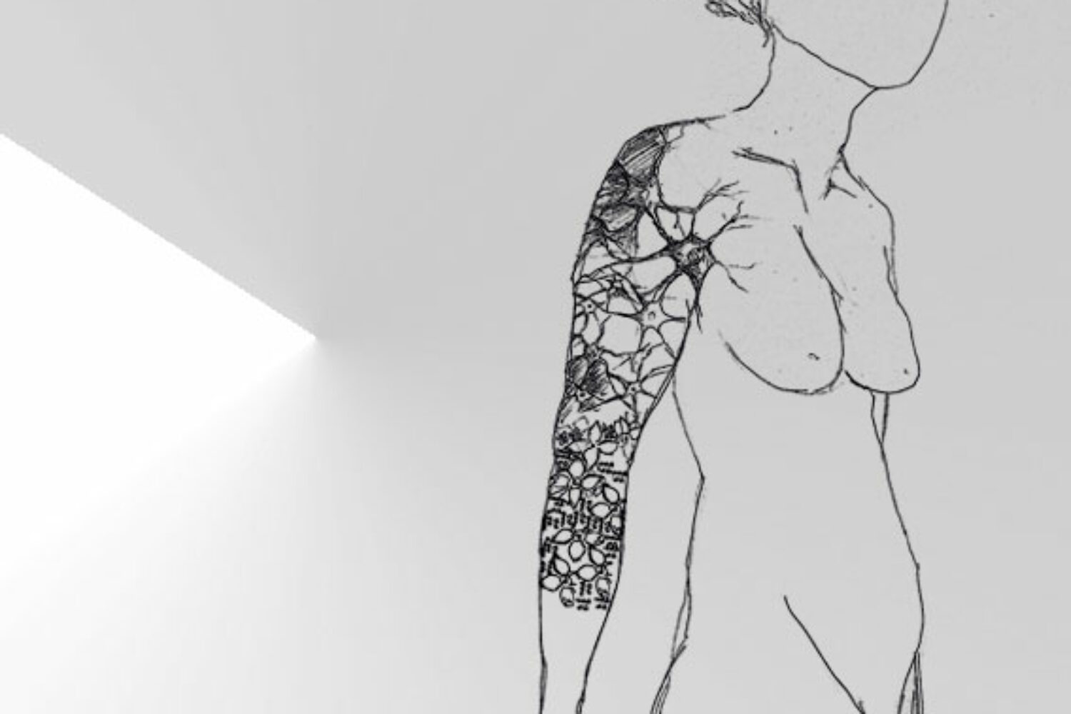 Si cette expression est une image utilisée pour décrire une sensibilité nerveuse extrême qui donne au sujet l’impression d’avoir les nerfs exposés à la surface, ceci n’est pas très loin de la réalité. En effet, le tissu nerveux est un réseau de nerfs sensitifs ramifiés qui forment une dentelle de nerfs qui affleure au niveau de l’épiderme. Et à cela, les terminaisons nerveuses ressemblent à des pédoncules de fleurs. Peau, fleur, affleure, à fleur de peau, dentelle au motif fleurs, dentelle à fleur de peau. « La dentelle est une écriture blanche lisible seulement lorsqu’il y a de la peau en dessous » écrit le poète et critique d’art John Berger . Les motifs de cette dentelle nerveuse sont plus ou moins denses en fonction des régions du corps. En effet, la peau a une innervation afférente très riche, dont la densité varie beaucoup d’un territoire à l’autre. La peau des doigts contient 2 500 récepteurs sensoriels/cm2 ; ce qui constitue une dentelle nerveuse dense. Cette dentelle nerveuse est en contact direct avec le milieu extérieur et représente un système sensoriel majeur. D’ailleurs, le peintre et écrivain français Eugène Fromentin a écrit : « La peinture est à fleur de toile, la vie n’est qu’à fleur de peau ». Sans la peau, ce tissu d’interface tactile, la vie serait privée du sens du toucher. Corinne : — La peau ne pourrait plus toucher. Patrick : — La peau ne sentirait plus qu’on la touche.